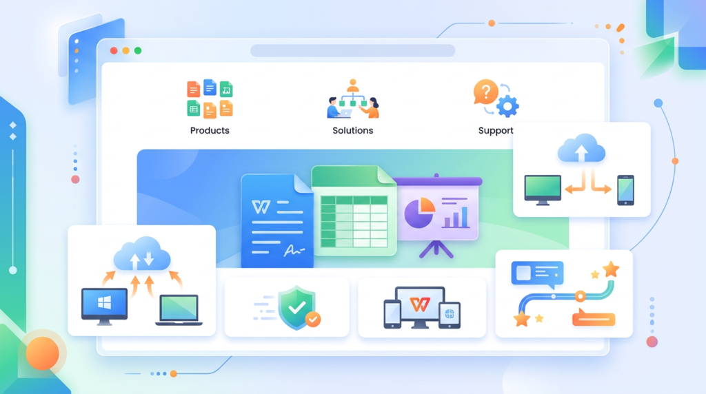 WPS官网远不只是一个下载页面,它承载了从产品获取到在线协作的完整办公生态。我逐一访问并梳理了官网首页六大核心入口,整理成以下导航表: